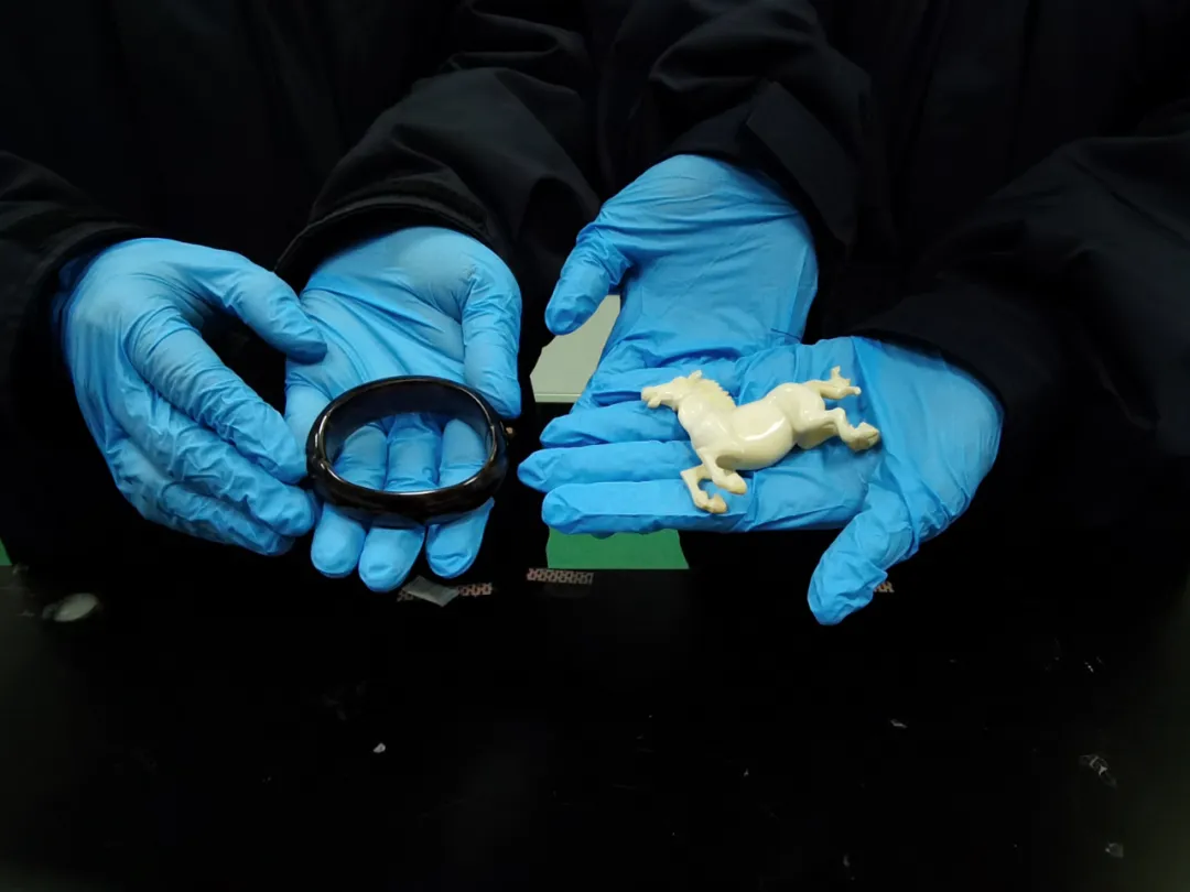 廣州海關所屬廣州郵局海關關員在對一批進境郵件進行監管時,發現2件申報為“鐘錶、手錶”的郵件機檢圖像異常。經進一步查驗,現場關員發現2個郵件內共有11件飾品,其中7件為馬造型雕像,外觀呈乳白色,質地堅硬、色澤温潤,表面具有明顯的象牙特有紋理結構;4件為手鐲、珠串及首飾盒等物品,外觀呈深褐色,表面光滑透亮,有不規則花紋。
