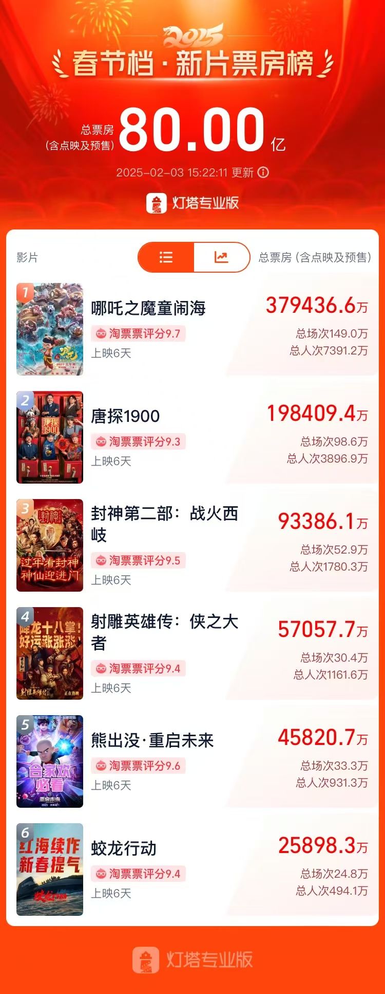 燈塔專業版數據顯示,截至2月3日發稿前,今年春節檔電影總票房(含預售)突破80億元,再創新高!