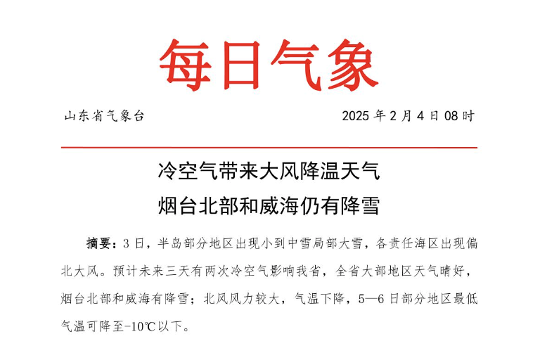 *4日白天到夜間,**煙台北部和威海天氣多雲間陰有小雪,其他地區天氣晴到少雲。*北風,北部沿海地區3~4級增強到5~6級陣風7~8級,聊城、菏澤和濟寧2~3級增強到3~4級陣風5~6級,其他地區2~3級增強到4~5級陣風6~7級。