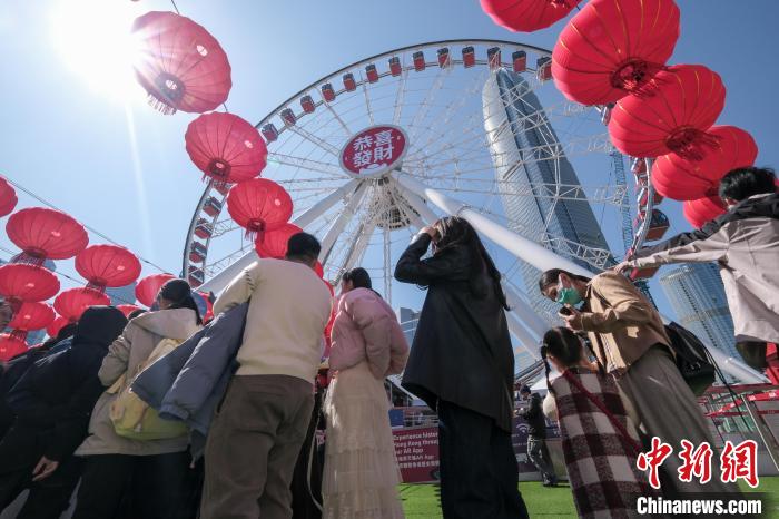 春節臨近,香港街頭洋溢着濃厚節慶氛圍。1月27日,香港中環摩天輪的圓形顯示屏上顯示“恭喜發財”等新春祝福語,附近也掛起大紅燈籠等裝飾。圖為香港市民與遊客在中環摩天輪處等候搭乘。 中新社記者 陳永諾 攝