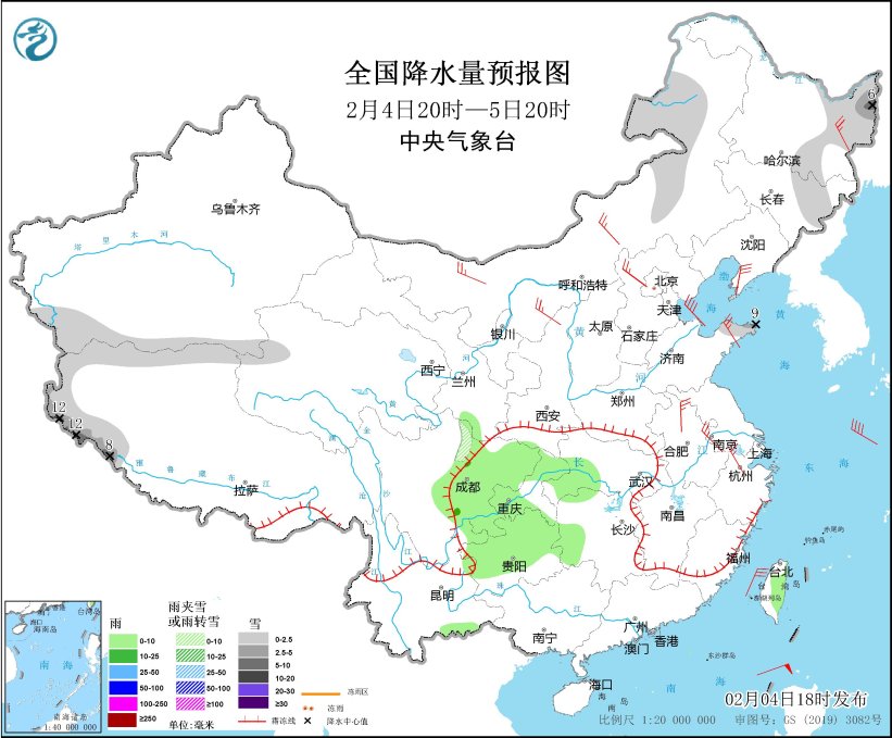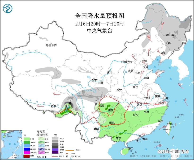 *2月6日20時至7日20時,*內蒙古東部、東北地區大部、新疆南部、西藏東部、西南地區北部等地部分地區有小到中雪或雨夾雪,其中,西藏東部等地部分地區有大到暴雪(10~18毫米)。江南大部、西南地區東部、華南大部、台灣島東部等地部分地區有小到中雨,其中,西藏東南部等地部分地區有大雨(25~35毫米)。內蒙古東南部、黑龍江西南部、遼寧中部、西藏南部、河北、天津北部、山東半島、安徽中部、浙江北部、四川南部、廣東東南部沿海等地部分地區有4~6級風;黃海大部、東海北部以及南海北部海域有6~7級風,陣風8級以上(見圖4)。