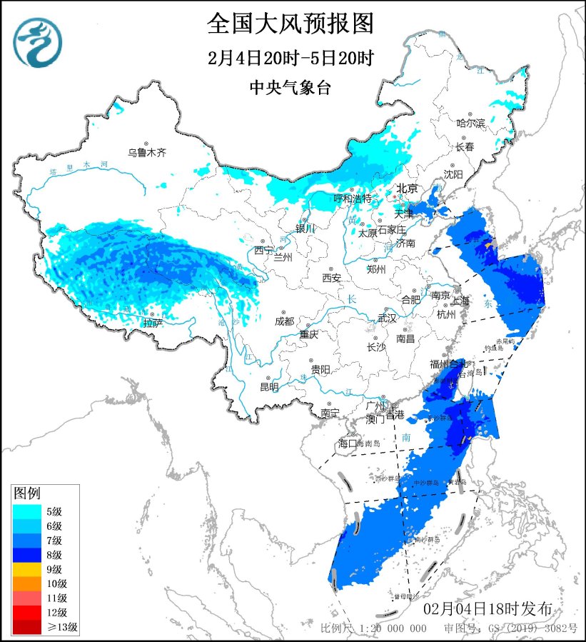 2月4日夜間至5日,受補充冷空氣影響,北方多晴好和大風天氣,6日起,新一股較強冷空氣將再度自北向南影響中東部,帶來大風降温天氣,黃淮及其以北大部降温6~8℃,其中西北地區東部、華北和黃淮的部分地區降温幅度達10℃以上,南方大部降温4~6℃,部分地區7~8℃;長江中下游以北地區伴有4~6級大風,陣風7~8級,其中,華北部分地區陣風9~10級,渤海及黃海北部有7~8級,陣風9~10級大風。中央氣象台2月4日18時繼續發佈大風藍色預警:預計,2月4日20時至5日20時,西藏中北部、青海南部、內蒙古中西部、華北北部和東部沿海等地部分地區有5~6級、陣風7~8級的大風,其中,西藏北部、青海西南部部分地區風力可達6~8級、陣風9~11級;黃海中東部和東南部海域、東海東部海域、台灣海峽、巴士海峽、南海東部和西南部海域將有7~8級、陣風9~10級的東北到偏北風,其中黃海東南部、台灣海峽、巴士海峽的部分海域風力可達9級、陣風10級。渤海、渤海海峽將有7級、陣風8級的東北風(見圖1)。