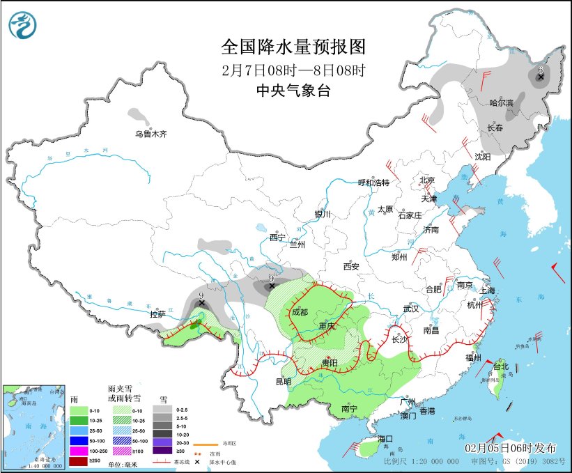 *2月7日08時至8日08時,*內蒙古東北部、東北地區中北部、西藏東部、川西高原、貴州中南部和西部等地部分地區有小到中雪或雨夾雪,其中,黑龍江東北部、西藏東部、川西高原北部等地局地有大雪(5~9毫米)。西藏東南部、湖南南部、西南地區東部、雲南東南部、華南西部和北部等地部分地區有小到中雨。內蒙古中東部、黑龍江西部、遼寧、山東半島、江淮中西部、江南東北部等地部分地區有4~6級風(見圖4)。