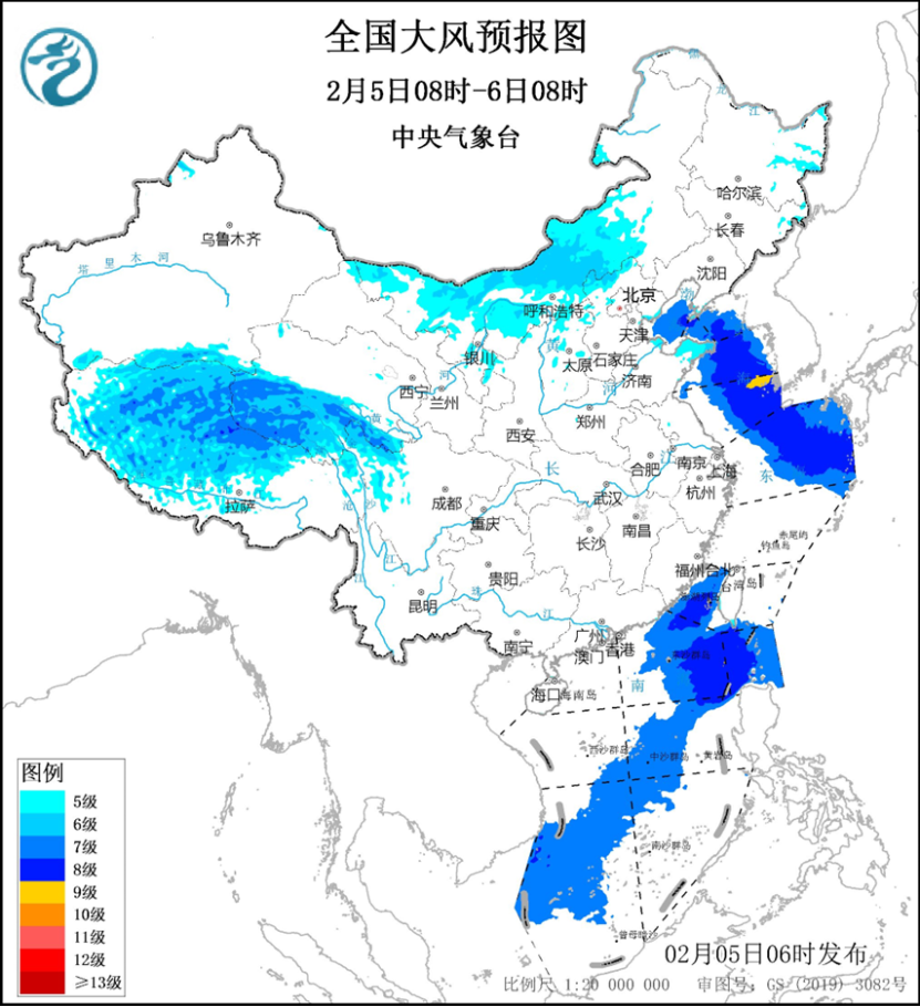 6日起,新一股強冷空氣將再度自北向南影響中東部,帶來大風降温天氣,黃淮及其以北大部降温6~8℃,其中西北地區東部、華北和黃淮的部分地區降温幅度達10℃以上,南方大部降温4~6℃,部分地區7~8℃;長江中下游以北地區伴有4~6級大風,陣風7~8級,其中,華北部分地區陣風9~10級,渤海及黃海北部有7~8級,陣風9~10級大風。中央氣象台2月5日06時發佈大風黃色預警:預計,2月5日08時至6日08時,西藏中北部、青海南部、內蒙古中西部、華北北部等地部分地區有5~6級、陣風7~8級的大風,其中,西藏中北部、青海西南部的部分地區風力可達6~8級、陣風9~11級;渤海、渤海海峽、黃海大部海域、東海北部海域、台灣海峽、巴士海峽、南海東部和西南部海域將有7~8級、陣風9~10級的大風,其中黃海東南部的部分海域風力可達9級、陣風10級(見圖1)。