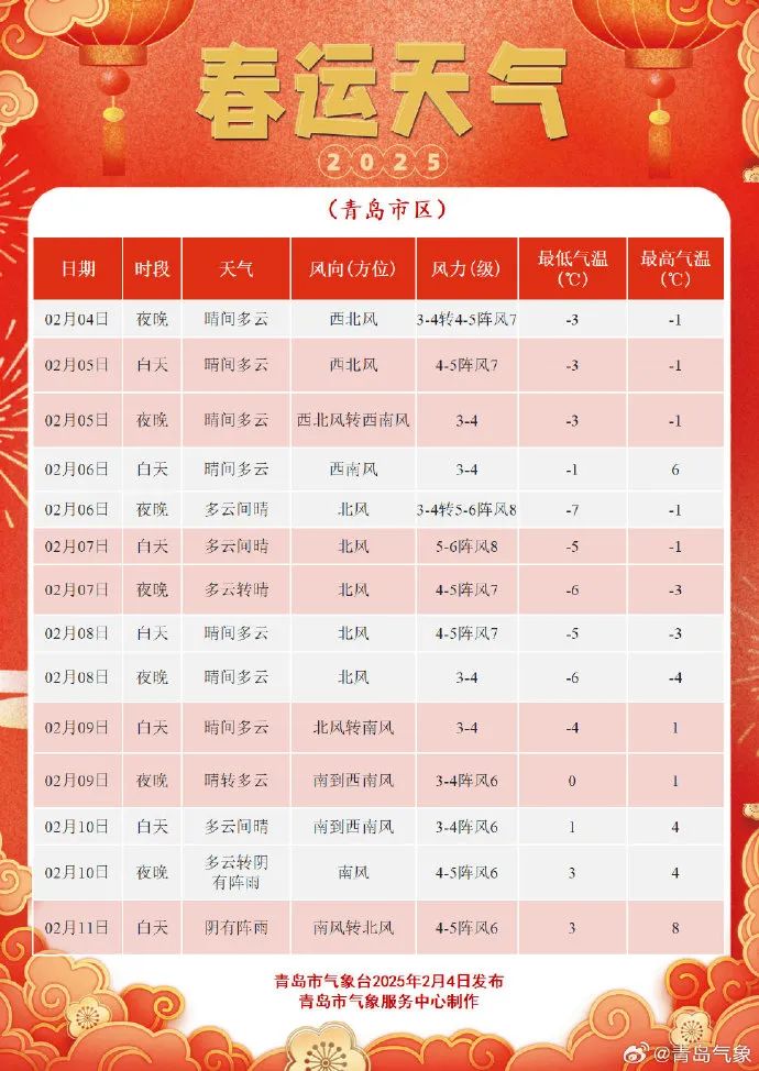 【青島市區】 今天白天,晴間多雲,西北風4到5級陣風7級轉3到4級,今天夜間,晴間多雲,西北風轉西南風3到4級,今天最高氣温-1℃,最低氣温-3℃,相對濕度20%-50%。