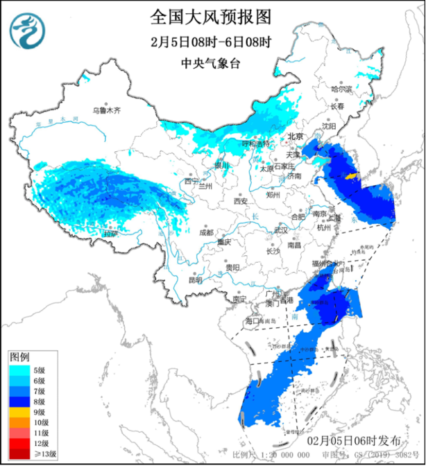 *今晨中央氣象台升級發佈大風黃**色預警:*5日,西藏中北部、青海南部、內蒙古中西部、華北北部等地部分地區有5~6級、陣風7~8級的大風,其中,西藏中北部、青海西南部的部分地區風力可達6~8級、陣風9~11級;渤海、渤海海峽、黃海大部海域、東海北部海域、台灣海峽、巴士海峽、南海東部和西南部海域將有7~8級、陣風9~10級的大風,其中黃海東南部的部分海域風力可達9級、陣風10級。