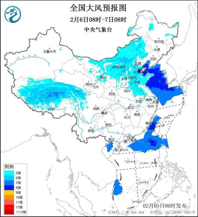 2月6日8時至7日8時,西藏中北部、青海南部、內蒙古大部、寧夏大部、陝西北部、華北中北部和東部、黃淮中東部等地部分地區有5~6級、陣風7~8級的大風,其中,西藏中北部、青海西南部、山西北部、京津冀、山東西部和北部等地的部分地區風力可達6~8級、陣風9~10級;渤海、渤海海峽、黃海大部海域、東海北部和西南部海域、台灣海峽、巴士海峽、南海北部和西南部海域、北部灣將有7~8級、陣風9~10級的大風,其中渤海的部分海域風力可達9級、陣風10級。