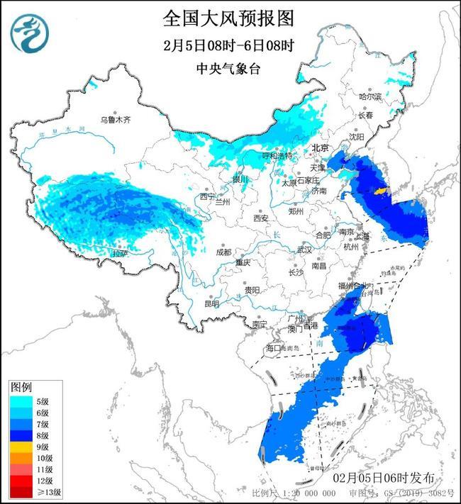 預計,2月5日8時至6日8時,西藏中北部、青海南部、內蒙古中西部、華北北部等地部分地區有5~6級、陣風7~8級的大風,其中,西藏中北部、青海西南部的部分地區風力可達6~8級、陣風9~11級;渤海、渤海海峽、黃海大部海域、東海北部海域、台灣海峽、巴士海峽、南海東部和西南部海域將有7~8級、陣風9~10級的大風,其中黃海東南部的部分海域風力可達9級、陣風10級。