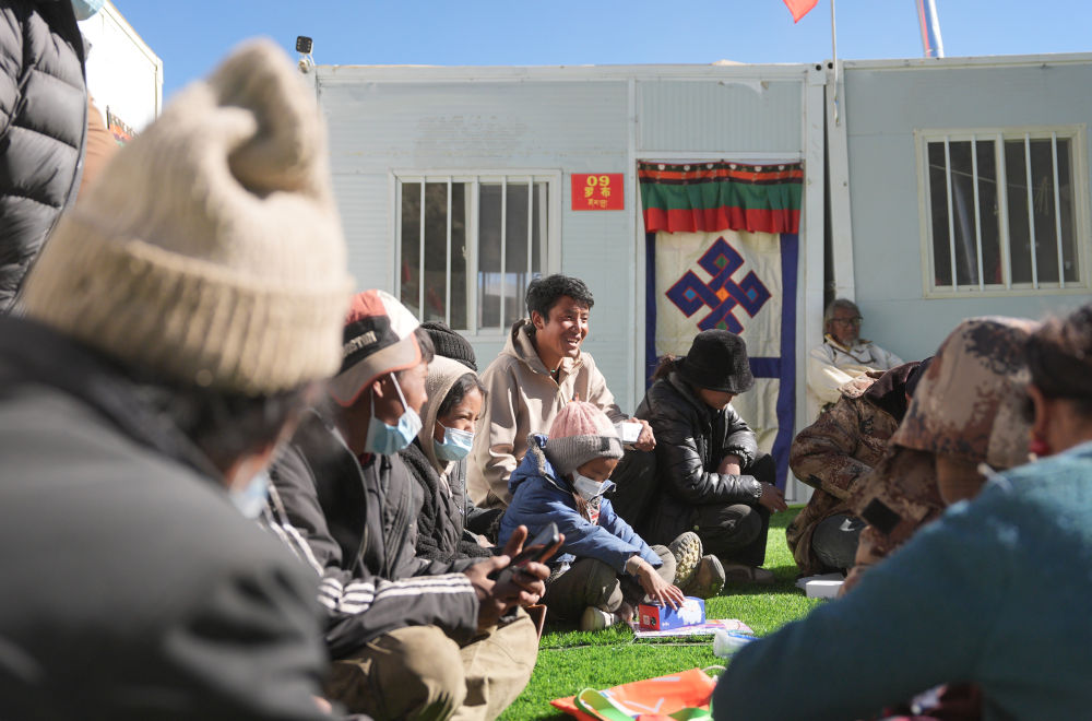 古榮村村委會主任桑傑(中)在安置點和羣眾閒聊。新華社記者 晉美多吉 攝
