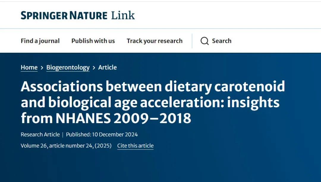 研究顯示,飲食中攝入更多的類胡蘿蔔素與減緩生物衰老顯著相關,表明其具有抗生物衰老作用,並且這種關聯在多種類胡蘿蔔素中都一致,包括β-胡蘿蔔素、β-隱黃質等,強調了通過飲食攝入足夠的類胡蘿蔔素以促進健康衰老的重要性。