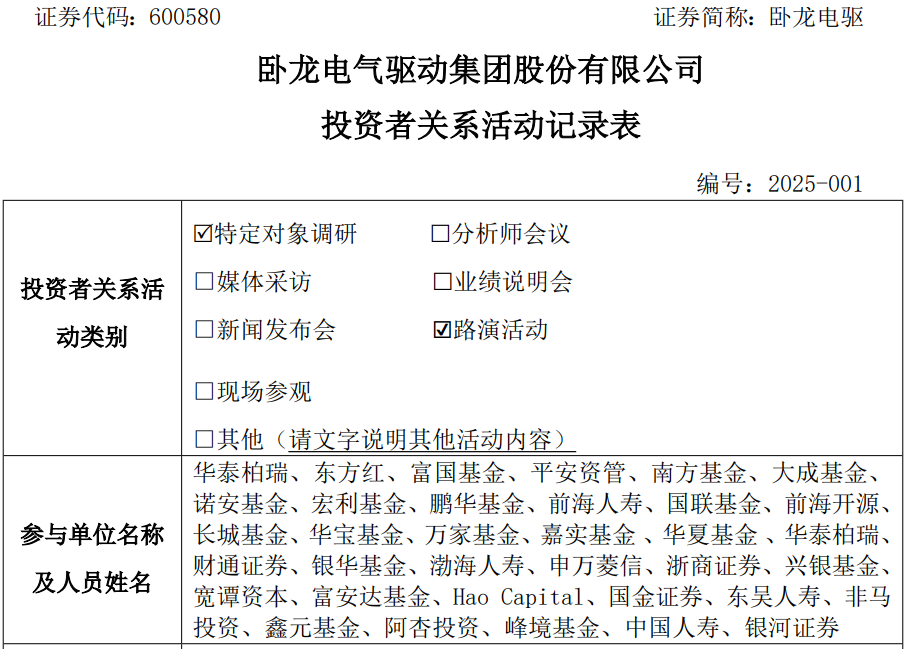 【環球網財經綜合報道】近日,上市公司卧龍電驅(600580.SH)發佈了《投資者關係活動記錄表》,披露公司接待了華泰柏瑞、東方紅、富國基金等多家投資機構調研,公司董事會秘書戴芩參與並解答投資機構代表提問。