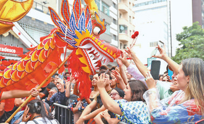 在巴西聖保羅“歡樂春節”遊園會上,現場觀眾與舞龍隊互動。本報記者 時元皓攝