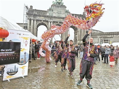 比利時“中國春節遊園廟會”上,舞龍隊正在表演。本報記者 牛瑞飛攝