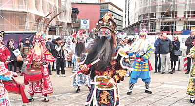 來自廣東汕頭潮陽的西門英歌隊一出場就將現場氣氛推向高潮。演員們雙手各持一根短木棒,配合節奏,上下左右對擊。傳統臉譜色彩鮮明,表演服飾華麗亮眼,“男女英歌鬥舞”令人目不暇接,整體呈現出強烈的力量感和蓬勃朝氣。一位德國觀眾對記者表示:“這是我第一次看到中國的春節民俗表演,它有着和德國節日類似的巡遊形式,但卻有自身的特色,非常有趣。”