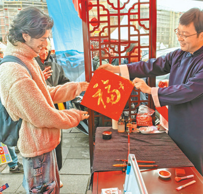 活動現場的非遺手工藝品和美食區也吸引了大量當地民眾參與,傳統手工藝糖畫、毛筆書法體驗展位前更是排起了長龍。當地民眾伊爾迪茲排隊很久終於如願領取禮品,他饒有興致地觀看現場工作人員寫下金色的“福”字,還特別要求加上他姓氏的中文譯名。“這是我第一次逛春節廟會,這裏熱鬧紅火,還有美食和禮品,向所有人開放,非常新奇,富有創意。如果有機會,我希望親自去中國走走看看!”伊爾迪茲説。