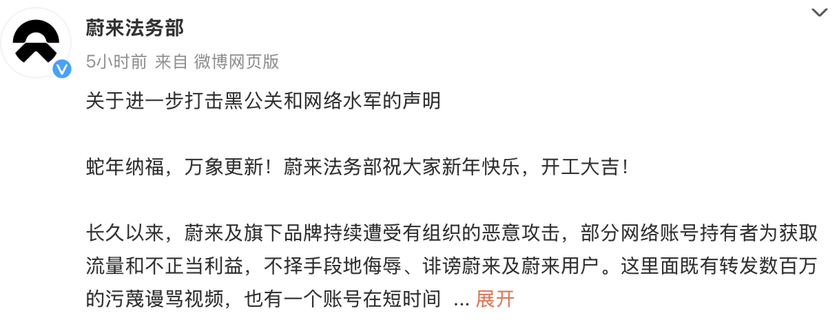 【環球網科技綜合報道】2月5日消息,蔚來法務部發布《關於進一步打擊黑公關和網絡水軍的聲明》,對外公佈了近期在打擊網絡侵權行為方面的維權進展。蔚來法務部表示,已對多個侵權賬號持有人提起訴訟,並將繼續採取法律措施維護公司及子品牌樂道的合法權益。
