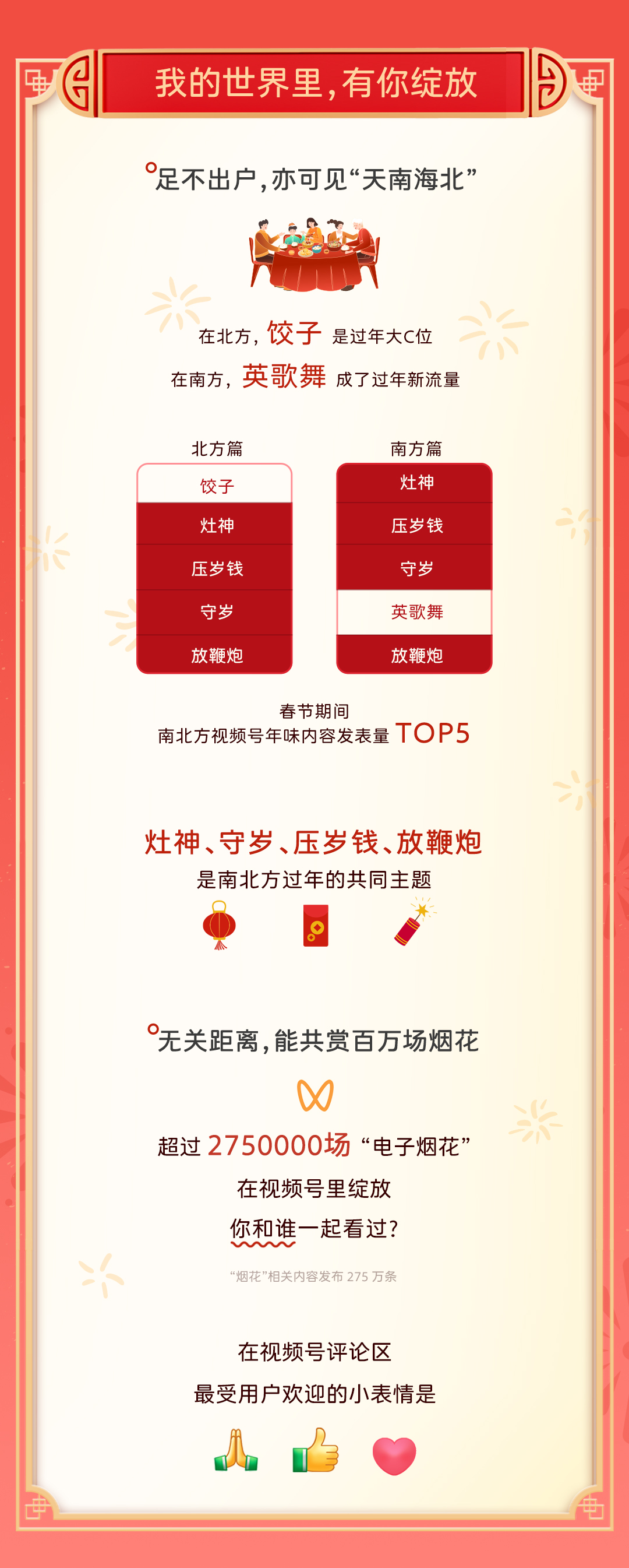 隨着短視頻記錄生活成為日常,年味兒內容也成為創作者們的熱門選題。春節期間,視頻號裏發表了 275 萬條“煙花”相關內容,網友們隔着不同的時空,卻能在線共賞同一場電子煙花;而南北方的創作者發佈的內容則一定程度上代表了習俗差異,南方創作者的內容中包含更多“英歌舞”元素,對北方創作者來説,“餃子”的江湖地位則不可動搖。但是,無論地區,“壓歲錢、守歲、灶神、放鞭炮”都是新春不變的主題,從南火到北。(勃潺)