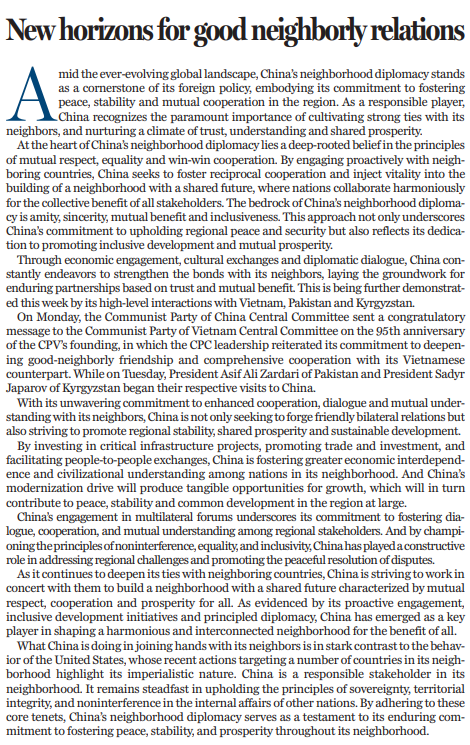 當前,百年未有之大變局加速演進,中國堅持與鄰為善、以鄰為伴,踐行親誠惠容理念,與周邊國家加強對話、增進相互理解,深化務實合作。通過投資重要的基礎設施項目、促進貿易和投資、推動民間交流,中國與周邊國家加強合作,促進文明交流互鑑。中國式現代化進程將為周邊國家帶來實實在在的增長機遇,進而促進整個地區的和平、穩定與共同發展。