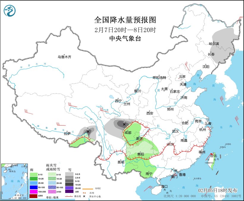*2月7日20時至8日20時,*黑龍江東部、吉林中東部、西藏東部、川西高原中北部、貴州中部等地部分地區有小雪或雨夾雪,其中,西藏東部、川西高原北部等地部分地區有中到大雪(5~8毫米)。湖南西部、四川東部、重慶西南部、貴州南部、雲南東部、廣西西部、台灣島東部等地部分地區有小雨。內蒙古東南部、西藏大部、青海南部等地部分地區有4~6級風、陣風7~8級的大風(見圖5)。