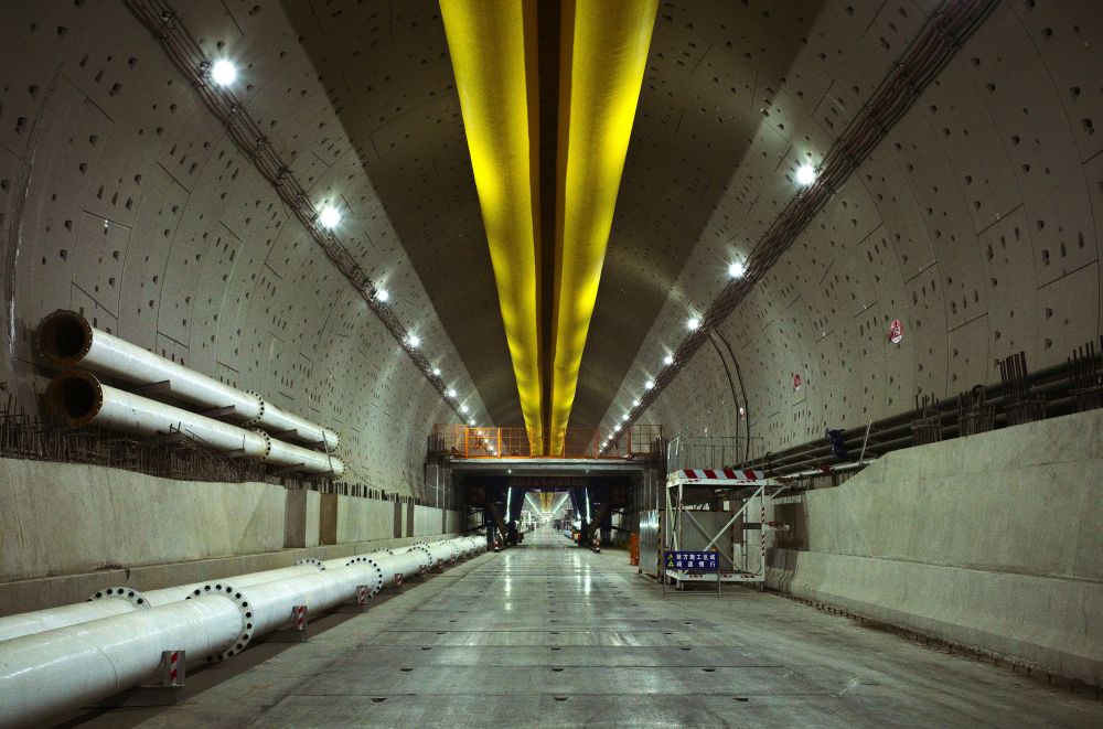 走進這個黃河之下的“地底世界”,冷白色燈光如星輝般灑在隧道管片上,濃濃“水泥風”撲面而來。