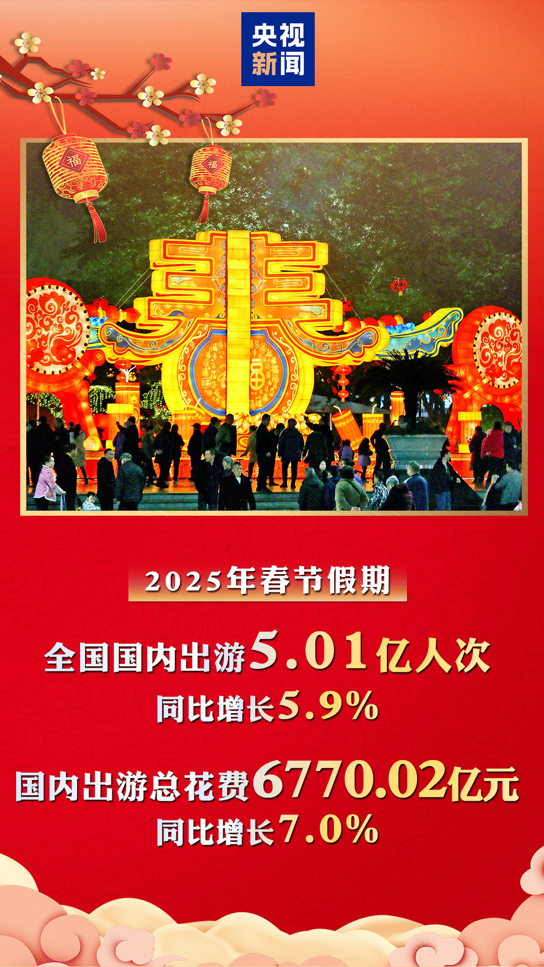 經文化和旅遊部數據中心測算,春節假期8天,全國國內出遊5.01億人次,同比增長5.9%;國內出遊總花費6770.02億元,同比增長7.0%。