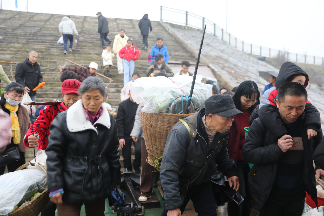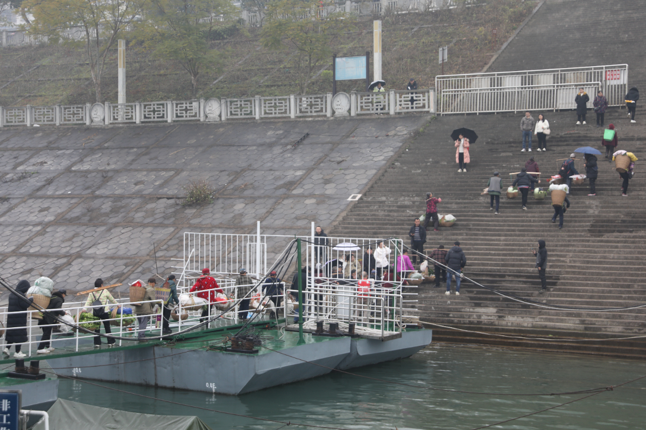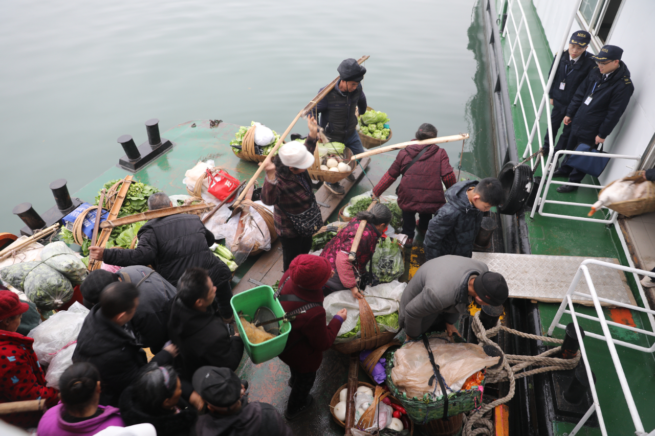 下午2時,菜農們揹着空揹簍陸續登船,等待返程。彭澤祥當天賣出了300多塊錢,“再賣一天,幾個娃兒的紅包就能更鼓一些啦”;陳立舉帶來的幾十斤蔬菜一售而空,“明天就不來了,開始忙年嘍”;冉龍權賣完菜,揹簍裏裝上了剛購買的對聯、糖果……見到記者,菜農們紛紛講述着一天的收穫。