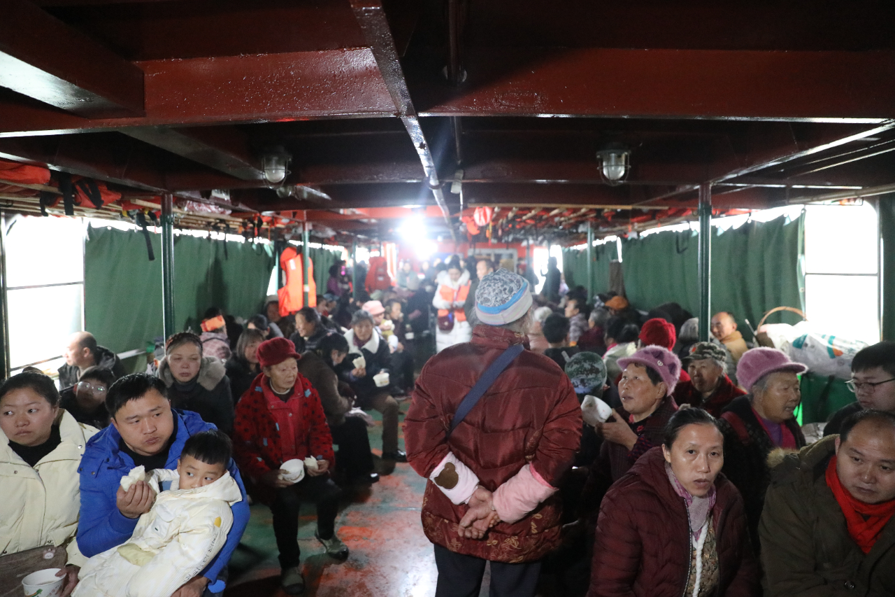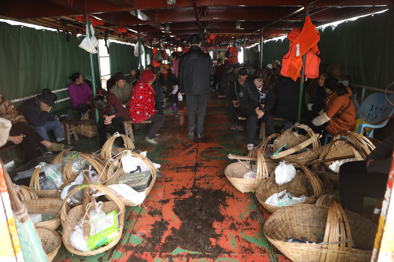 “對我們菜農而言,還是坐船方便,票價便宜,能挑扁擔和揹簍,活雞活鴨也能上船。”在和陳立舉交談的過程中,又上來了十來名菜農,雞與鵝在甲板上叫個不停。過年了,船艙裏除了菜農,還有采買年貨、走親訪友的村民。