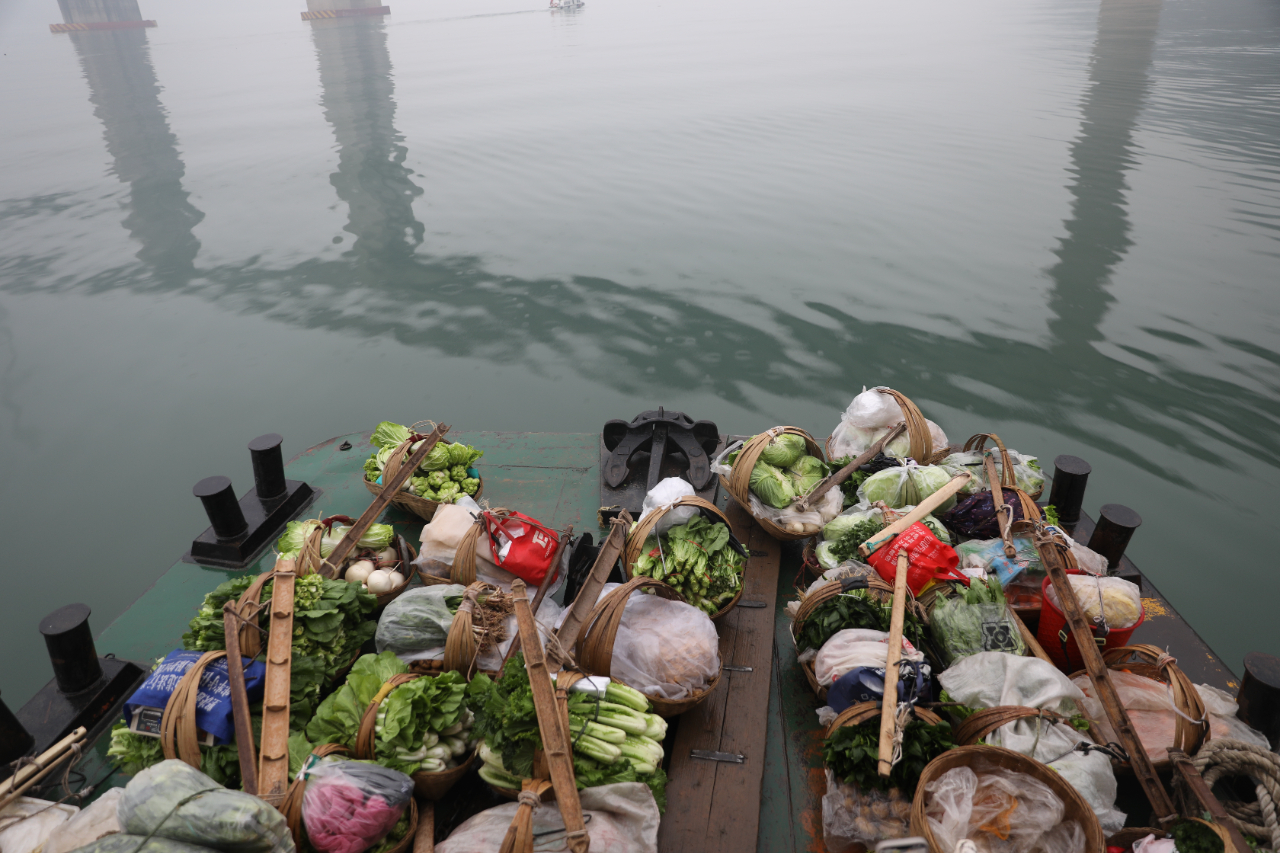 “早上5點多從家裏出發,揹着這40多斤的菜走了40分鐘,坐船去忠縣賣菜已經十多年嘍。”跟隨陳立舉上船,他一邊打理着揹簍裏的土豆、豌豆尖,一邊和記者講述這條船的故事。