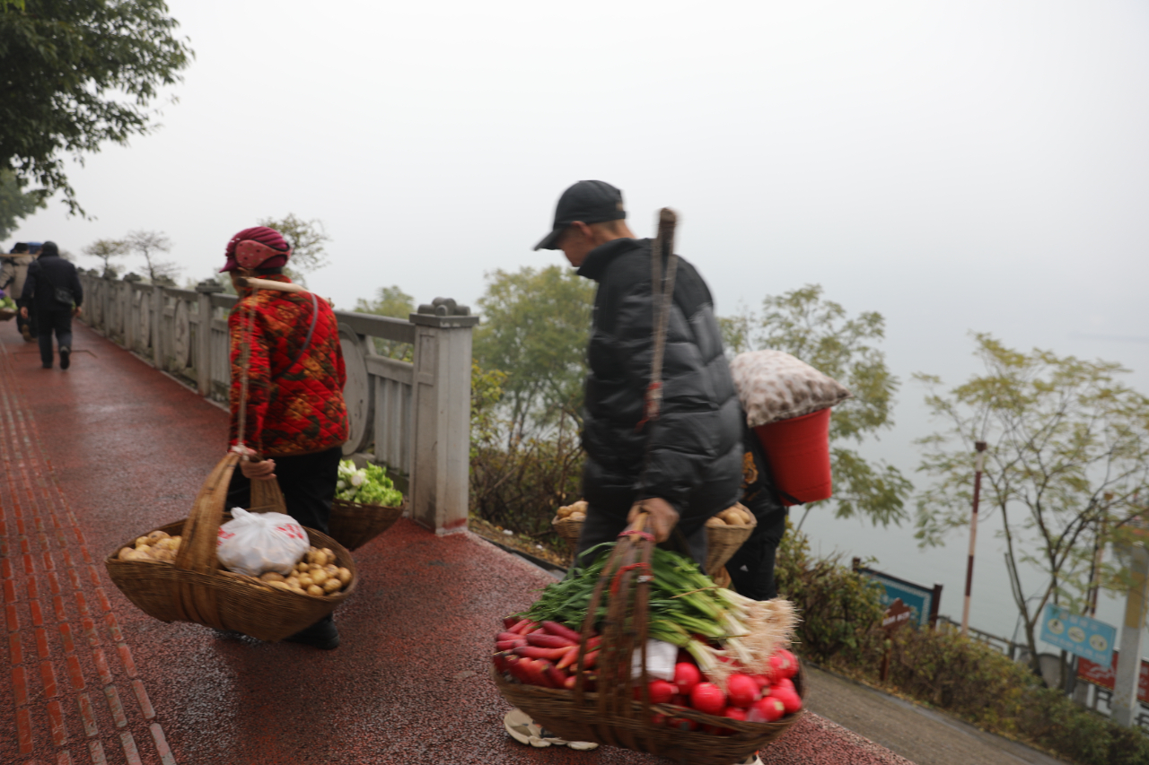 10時,“渝忠客2180”抵達西山碼頭,比原計劃晚了1個小時。船一靠岸,就有人趕來幫老人把菜簍搬下船。100多級碼頭階梯上,肩挑的、背扛的、手提的……全是賣菜和幫忙的人。
