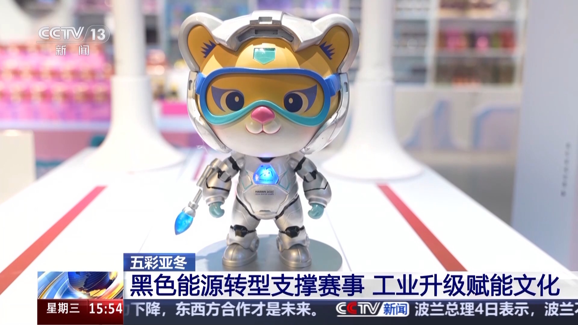 *總枱央視記者 周培培:*這是鋁鎂俠濱濱。它和本屆亞冬會普通的吉祥物手辦不一樣的,除了這身銀色的盔甲之外,最厲害的就是它的底座了,上面寫着“共和國銀色之柱”,因為它的材料,和我身邊正在生產的我國C919大飛機兩個翅膀的鋁合金材料是同款。