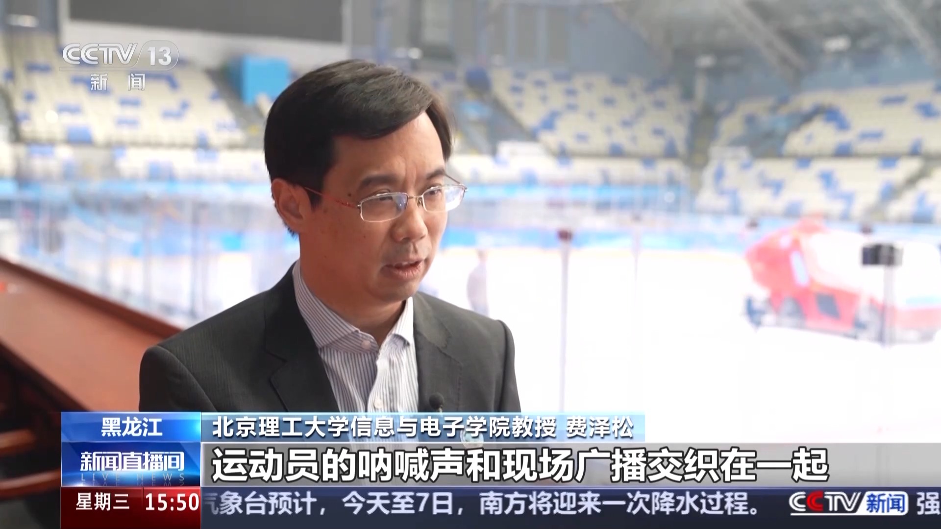 *北京理工大學信息與電子學院教授 費澤松:*我們在三到五年之前就開展了針對體育場館這種特殊場景,結合人工智能技術,提出了抗噪聲語音通信技術。學習了100多種噪聲,比如説像亞冬會觀眾的歡呼聲、運動員的吶喊聲和現場廣播交織在一起,那麼我們通過去背景噪聲的算法來提升通話的質量。