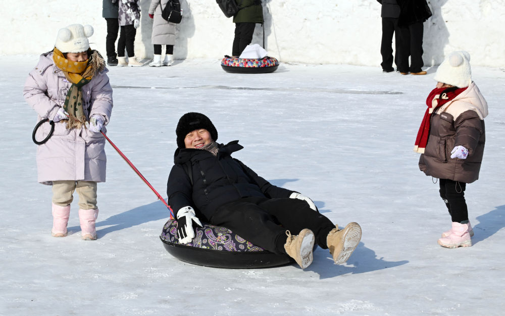 1月30日,在哈爾濱松花江冰雪嘉年華園區,遊客在玩雪圈。新華社發(劉洋 攝)