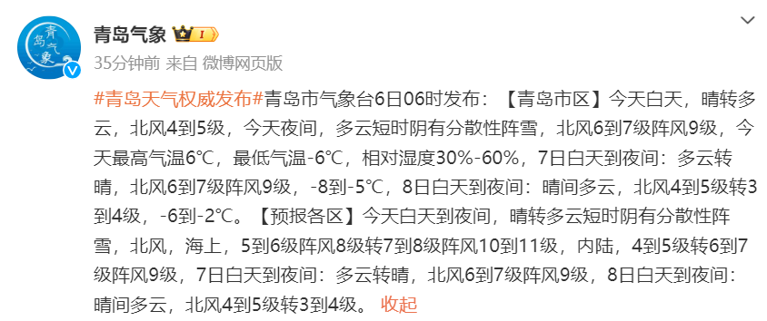 *【青島市區】*今天白天,晴轉多雲,北風4到5級,今天夜間,多雲短時陰有分散性陣雪,北風6到7級陣風9級,今天最高氣温6℃,最低氣温-6℃,相對濕度30%-60%,