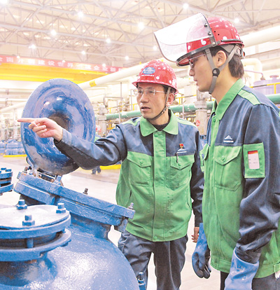 潘從明(左)在指導班組成員操作設備。本報記者 趙帥傑攝