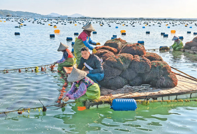 農曆正月初八上午9點,福建漳州下西坑村駐村第一書記吳先哲坐上船,向養殖海域駛去。航道兩側,一個個藍色浮球隨海浪起伏,圍出一塊塊海上農田。