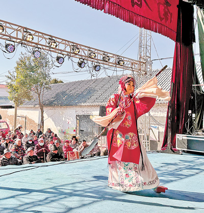 台下一陣鞭炮響,台上一通鑼鼓聲。正月初八上午9時,戲台帷幕緩緩拉開。河南許昌鄢陵縣豫劇團演員們依次入場,唱、念、做、打樣樣嫺熟,將豫劇《五世請纓》呈現在村民面前。
