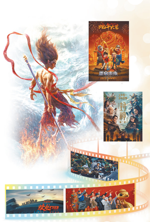 今年春節檔影片題材多元、類型豐富、市場關注度高。《封神第二部:戰火西岐》續寫前作暗線伏筆,展現人物的成長軌跡和戰爭場面;《哪吒之魔童鬧海》講述哪吒鬧海故事,延續“超級喜劇、超燃視效”風格;《唐探1900》保留類型風格的同時,在內容創新和製作規模上升級;《蛟龍行動》作為我國第一部核潛艇電影,在水下呈現廣闊戰場與複雜戰況;《熊出沒·重啓未來》是《熊出沒》科幻五部曲的最終章,用“極致的浪漫、大膽的想象”呈現一場冒險;《射鵰英雄傳:俠之大者》改編自金庸經典武俠小説,呈現了“俠之大者,為國為民”。