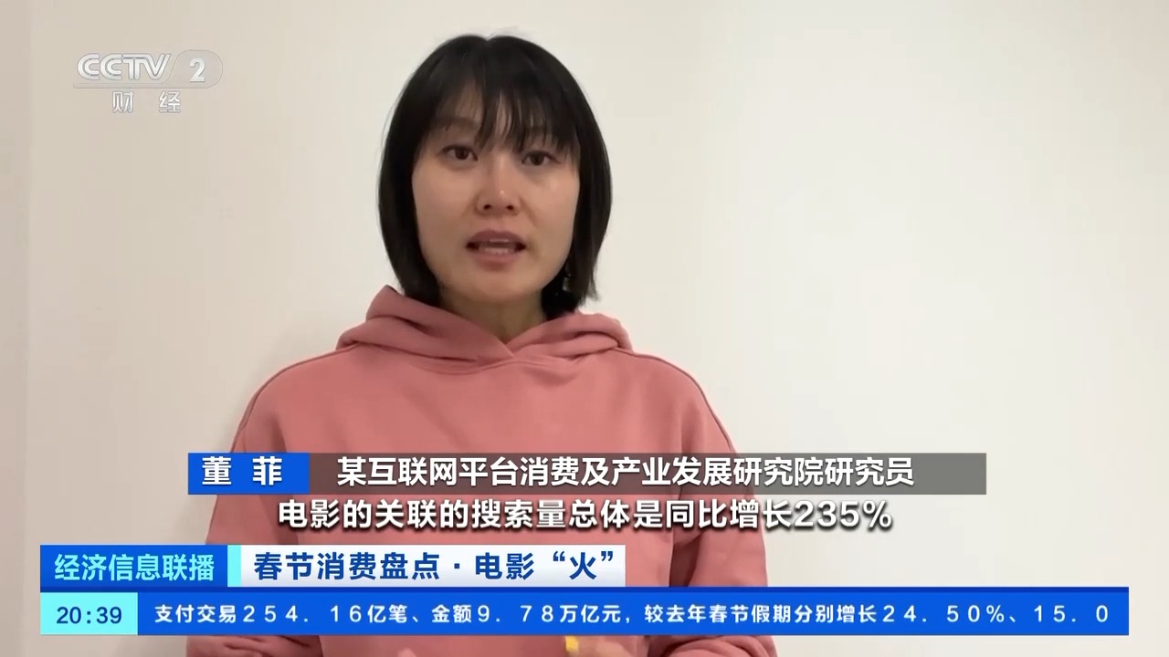 *某互聯網平台消費及產業發展研究院研究員 董菲:*從搜索熱度來看,電影關聯搜索量總體同比增長235%,關聯的產品銷量同比增長超5倍,其中哪吒關聯產品的銷量同比增長超30倍,射鵰英雄傳相關產品增長超10倍。
