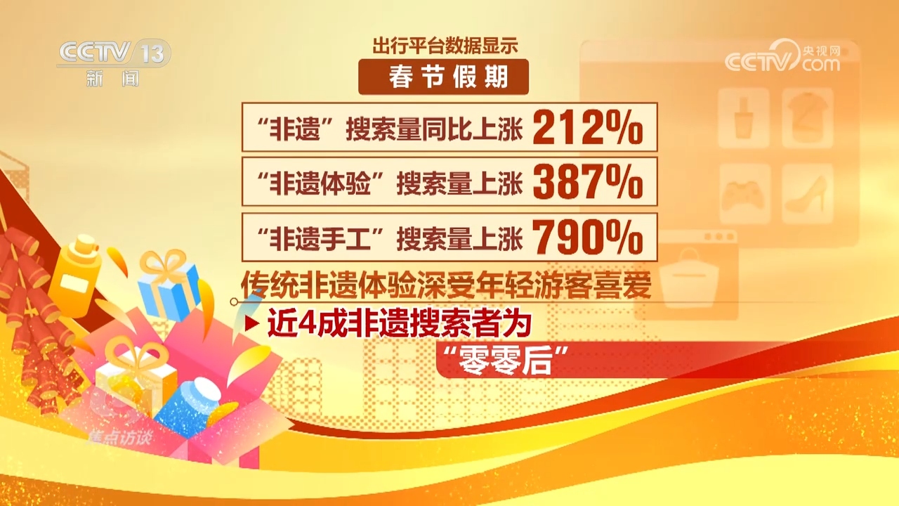 今年春節文旅市場人氣旺盛。出行平台數據顯示,春節假期“非遺”搜索量同比上漲212%,“非遺體驗”搜索量上漲387%,“非遺手工”搜索量上漲790%,傳統非遺體驗深受年輕遊客喜愛,近四成非遺搜索者為“00後”。值得注意的是,今年春節,包括深中通道、滬蘇湖高鐵在內一批新修建的交通要道迎來開通後的首個春運。城市間距離的拉近,讓雙向互動的跨城消費別樣紅火。出行平台數據顯示,今年春節有近七成的旅客選擇跨城出遊,比去年春節增加一倍。