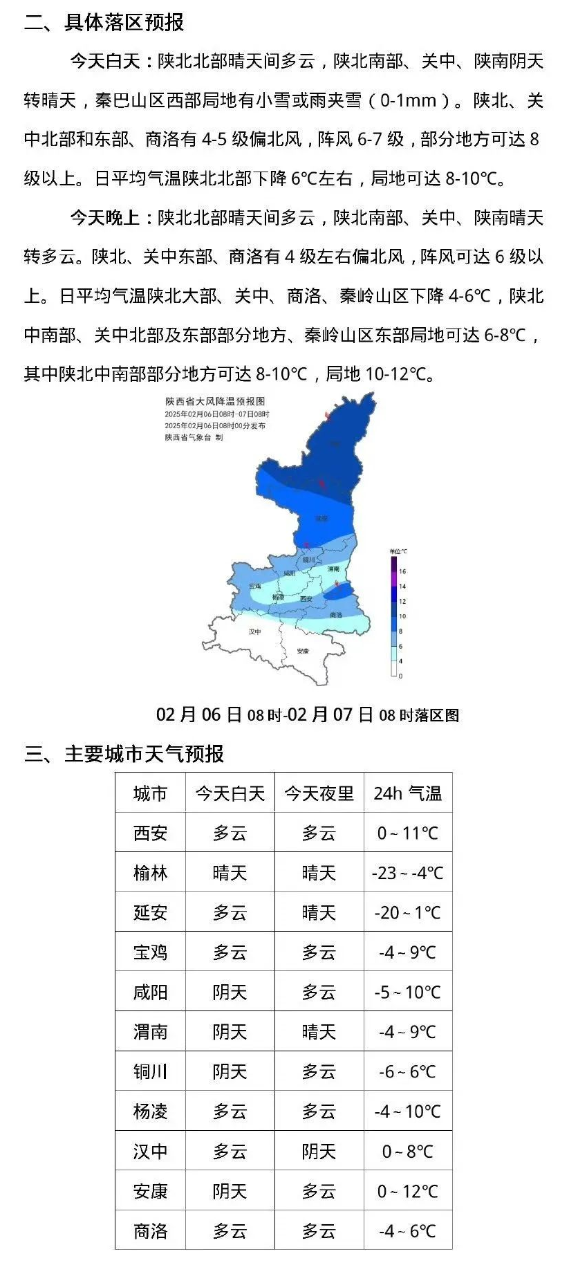 目前榆林市西部縣區、延安市西部縣區已受6~8級大風影響 ,預計下述地區未來24小時內將受大風影響,平均風力6-7級,陣風9級(20.8m/s)以上:延安市安塞區、吳起縣、志丹縣、子長市,榆林市榆陽區、橫山區、神木市、府谷縣、定邊縣、靖邊縣、綏德縣、米脂縣、佳縣、吳堡縣、清澗縣、子洲縣。同時,預計下述地區平均風力5-6級,陣風7級(13.9m/s)以上:西安市閻良區、臨潼區、長安區、鄠邑區、高陵區、藍田縣、周至縣,寶雞市太白縣、麟遊縣、千陽縣、隴縣、鳳縣,咸陽市三原縣、涇陽縣、禮泉縣、乾縣、永壽縣、彬州市、淳化縣、旬邑縣、長武縣,銅川市王益區、印台區、耀州區、宜君縣,渭南市臨渭區、韓城市、華陰市、華州區、潼關縣、大荔縣、澄城縣、合陽縣、蒲城縣、富平縣、白水縣,延安市寶塔區、黃陵縣、黃龍縣、宜川縣、洛川縣、富縣、甘泉縣、延川縣、延長縣,漢中市洋縣、留壩縣、佛坪縣,安康市寧陝縣,商洛市商州區、洛南縣、丹鳳縣、商南縣、山陽縣、鎮安縣、柞水縣,請注意防範。另外,未來24小時最低氣温陝北下降8-10℃,局地10℃以上,關中北部及東部、陝南東部下降4-6℃,局地6℃以上 ,請注意防範。