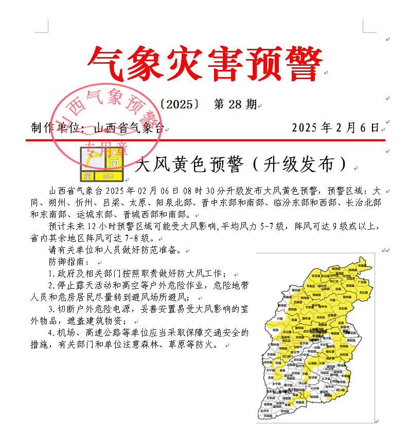 山西省氣象台2025年02月06日08時30分升級發佈大風黃色預警,預警區域:大同、朔州、忻州、呂梁、太原、陽泉北部、晉中東部和南部、臨汾東部和西部、長治北部和東南部、運城東部、晉城西部和南部。預計未來12小時預警區域可能受大風影響,平均風力5-7級,*陣風可達9級或以上,省內其餘地區陣風可達7-8級。*請有關單位和人員做好防範準備。