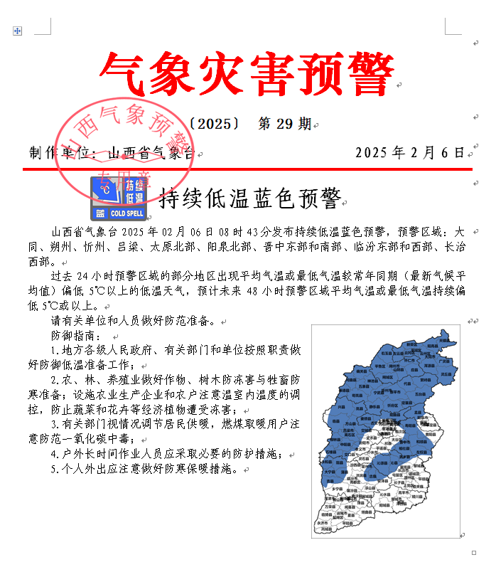 山西省氣象台2025年02月06日08時43分發布持續低温藍色預警,預警區域:大同、朔州、忻州、呂梁、太原北部、陽泉北部、晉中東部和南部、臨汾東部和西部、長治西部。過去24小時預警區域的部分地區出現平均氣温或最低氣温較常年同期(最新氣候平均值)偏低5℃以上的低温天氣,*預計未來48小時預警區域平均氣温或最低氣温持續偏低5℃或以上。*請有關單位和人員做好防範準備。