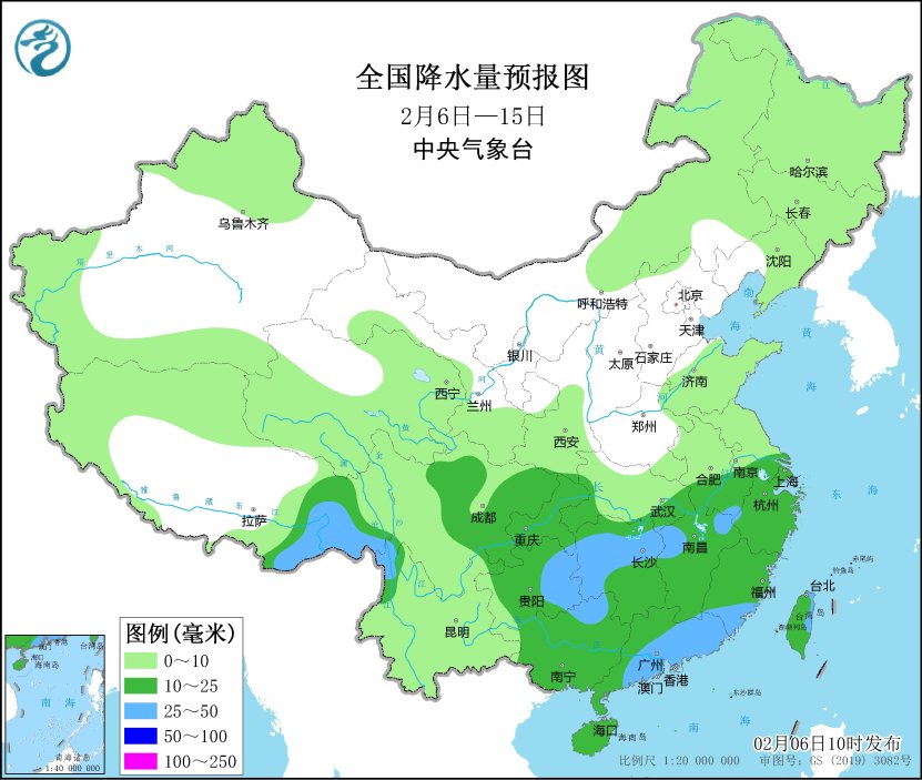 未來10天(2月6-15日),江淮、江漢、江南、華南及西南地區東部等地部分地區累計降水量有5~15毫米,局地20~40毫米;內蒙古東部、東北地區累計降水量有3~6毫米;我國其餘大部地區降水不足3毫米或基本無降水。