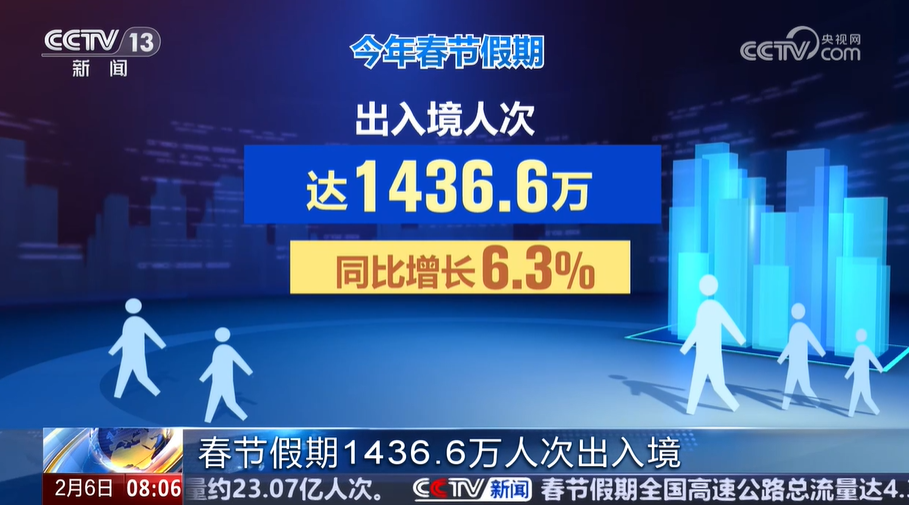 據國家移民管理局統計,今年春節假期出入境人次達1436.6萬,同比增長6.3%。其中,內地居民出入境767.1萬人次,同比增長5%;港澳台居民573.7萬人次,同比增長5.6%;外國人95.8萬人次,同比增長22.9%。