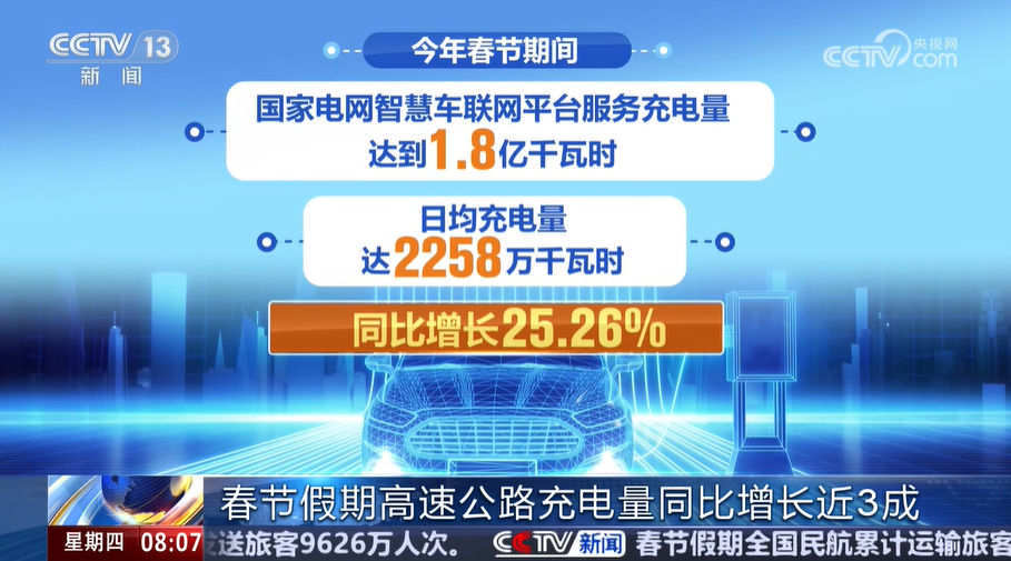 今年春節假期,國家電網智慧車聯網平台服務充電量達到1.8億千瓦時,日均充電量達2258萬千瓦時,同比增長25.26%。其中,高速公路充電量達到5727萬千瓦時,日均充電量716萬千瓦時,同比增長29.48%。