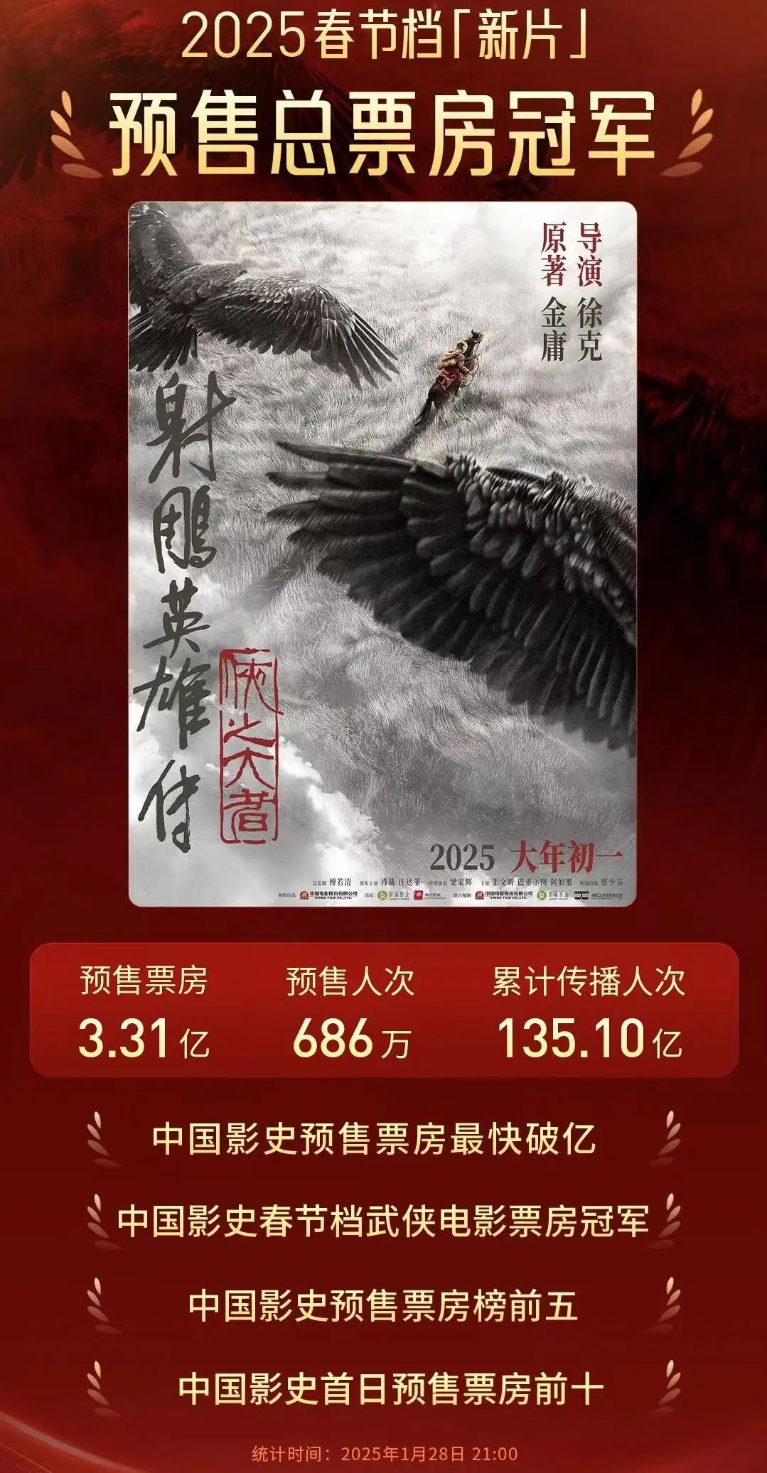 根據國家電影專資辦統計,2025春節檔最終預售超過13.1億元,正月初一預售首次突破10億,兩項皆創歷史新高。其中《射鵰英雄傳:俠之大者》預售達3.3億元,為預售冠軍,並最終躋身中國電影預售票房影史前5。