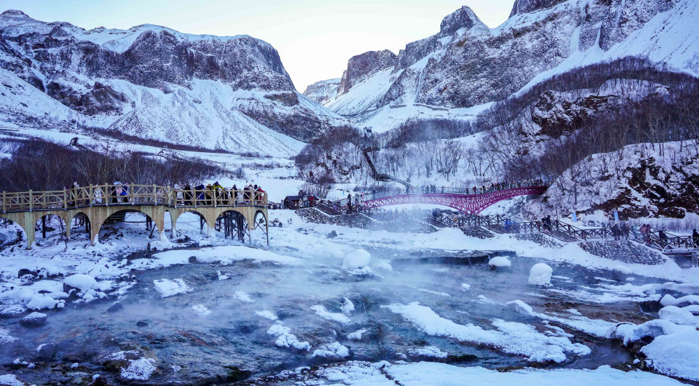長白山天池以北的延邊州,温泉室外的樹枝上覆滿積雪,泡池內滾燙的地熱源源不斷。伸出腳尖觸水,一股暖意傳遍全身。延邊雲集安圖火山泉、龍井氟温泉、延吉低氘温泉等多種特色温泉,吸引海內外眾多遊客慕名而來。