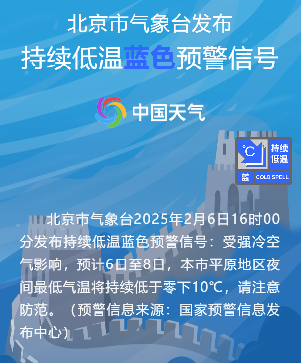 北京市氣象台2月6日16時發佈持續低温藍色預警信號:受強冷空氣影響,預計6日至8日,本市平原地區夜間最低氣温將持續低於零下10℃,請注意防範。此外,中央氣象台今早6點繼續發佈大風黃色預警和寒潮藍色預警。
