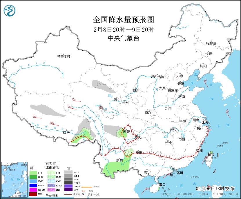 *2月8日20時至9日20時,*西藏北部和東部、青海北部、甘肅祁連山一帶、川西高原、貴州西南部等地的部分地區有小雪或雨夾雪。西藏東南部、雲南中東部、台灣島北部等地的部分地區有小雨。西藏、青海南部等地的部分地區有4~6級風,陣風7~8級;巴士海峽、南海中東部海域、台灣海峽、南海南部海域將有6~8級、陣風9~10級的偏北風(見圖5)。