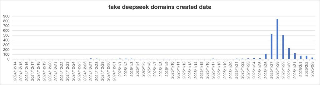 根據對2024年12月1日至2025年2月3日期間的域名註冊情況進行了統計分析,發現在此期間共出現了2650個仿冒DeepSeek的網站。大規模的仿冒域名註冊活動從2025年1月26日開始,並在1月28日達到高峯,儘管隨後的增長幅度有所減少,但仿冒域名的數量仍在持續增加。